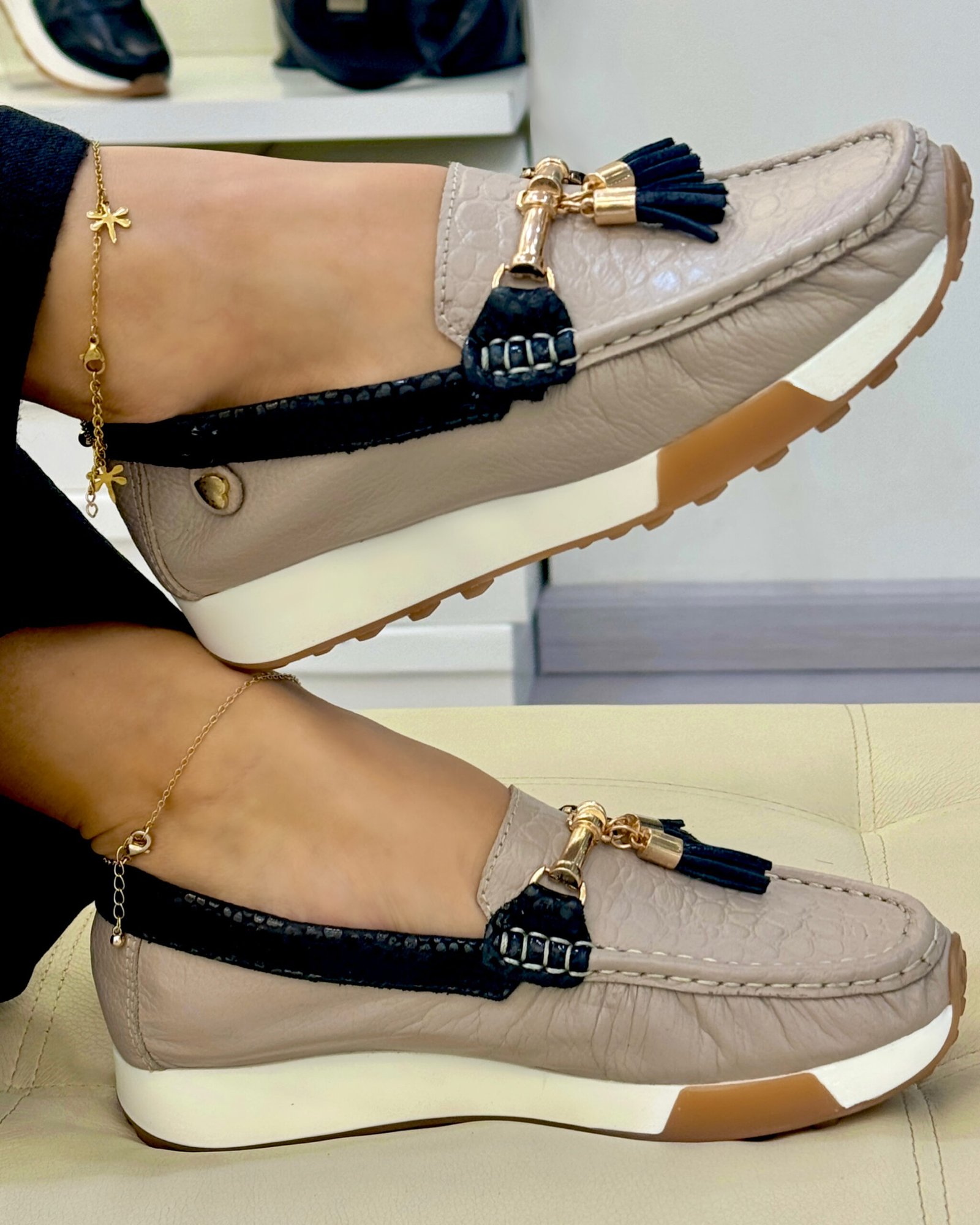 Los mocasines Capuchino en cuero con detalle negro de Calzados Maryori López están pensados para mujeres que buscan un diseño refinado, versátil y fácil de combinar. Su tono capuchino transmite calidez y sofisticación, mientras el detalle negro aporta contraste y carácter, creando un mocasín elegante y moderno a la vez.