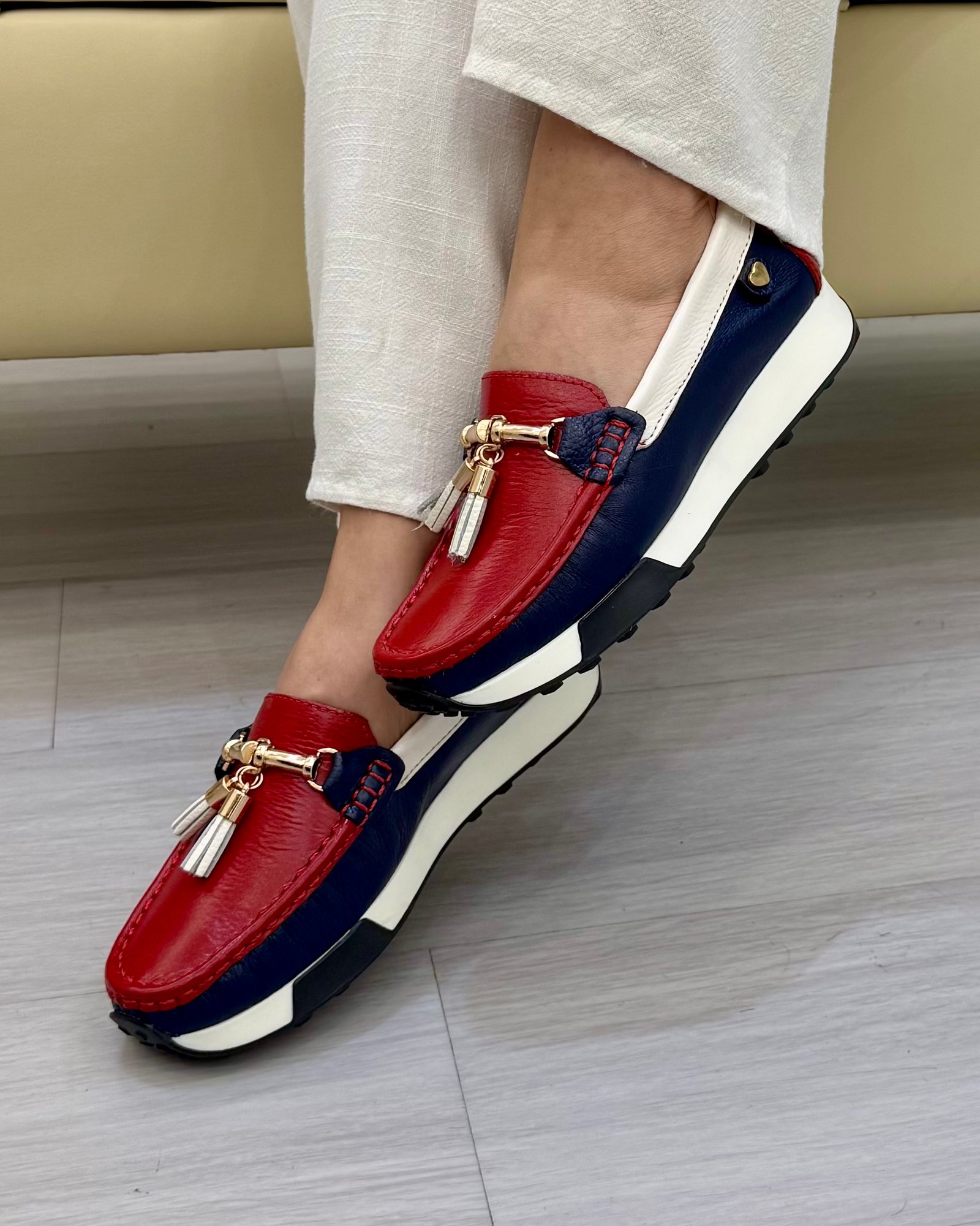 Los mocasines Danielle en cuero rojo con detalles en azul y blanco de Calzados Maryori López están diseñados para mujeres que disfrutan del color, el estilo y la comodidad en su día a día. Su combinación cromática aporta un aire moderno y fresco, ideal para darle vida a looks neutros o casuales con un toque distintivo.