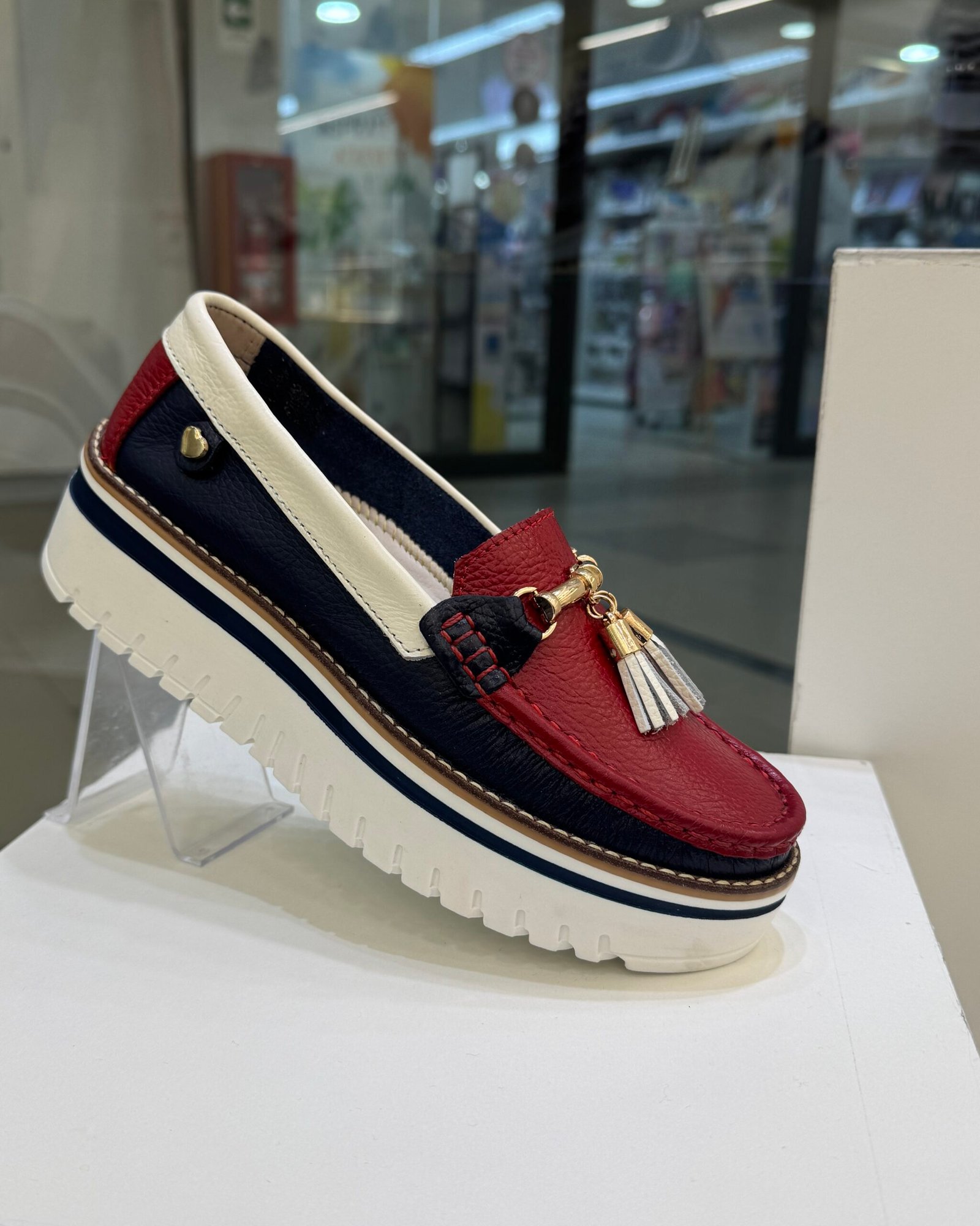 Los mocasines cuero mujer modelo Danielle Rojo de Calzados Maryori López combinan elegancia y resistencia. Gracias a su plataforma de 5 cm y su horma estándar, ofrecen un equilibrio perfecto entre altura y comodidad. Además, su suela antideslizante de PVC espanso te mantiene seguro en todo tipo de superficies.