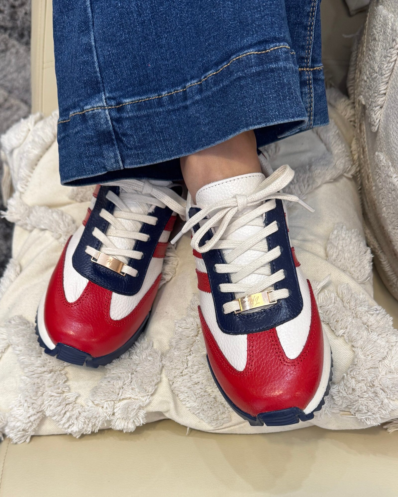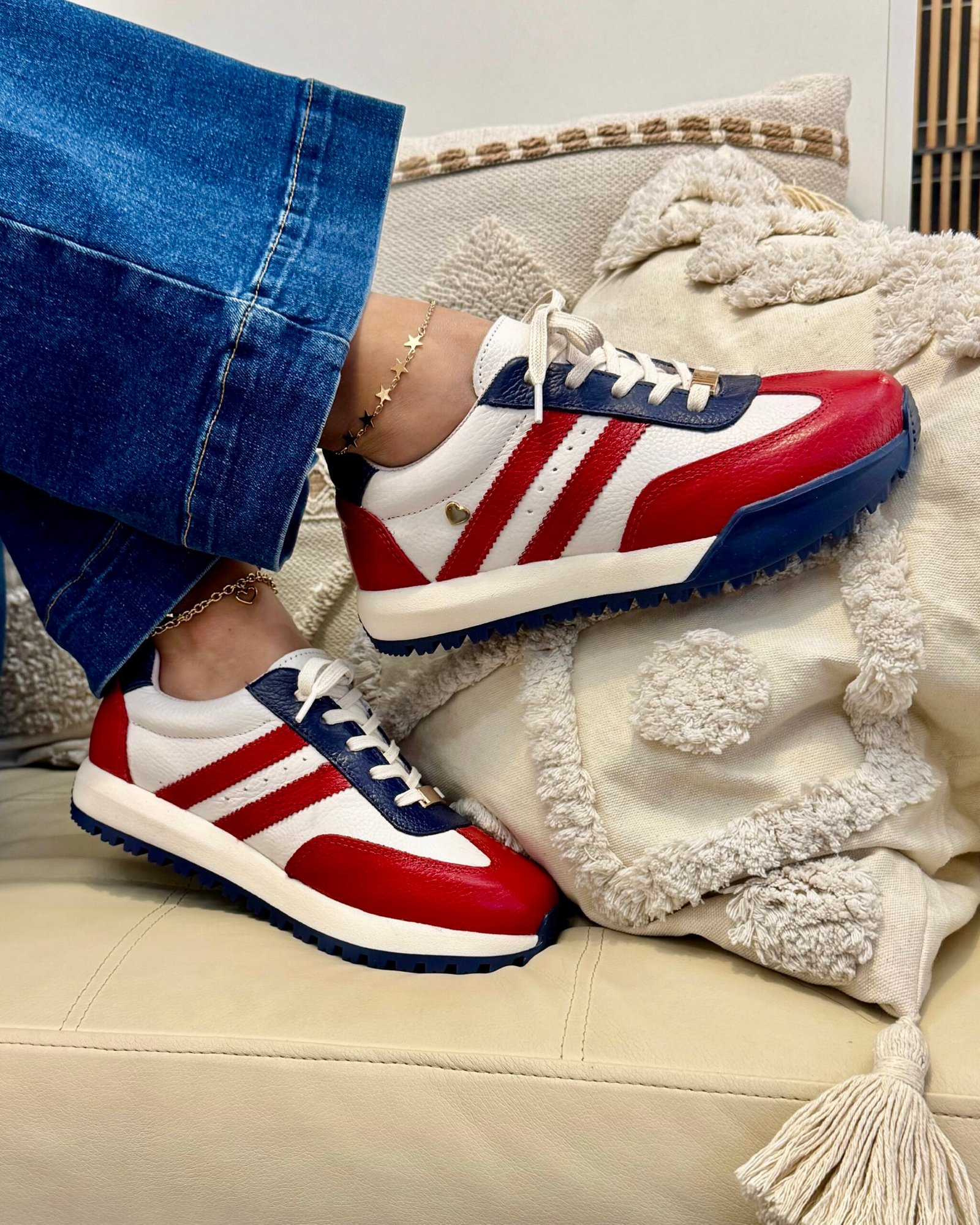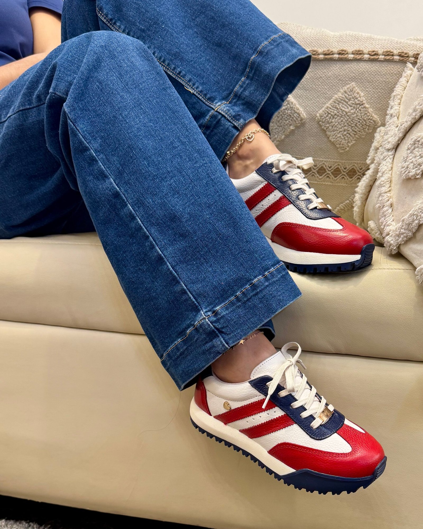 Las zapatillas Luciana en cuero rojo con detalles en azul y blanco de Calzados Maryori López están pensadas para mujeres que aman el movimiento, el color y un estilo que se hace notar. El rojo protagonista transmite fuerza y personalidad, mientras los acentos azul y blanco aportan equilibrio y un aire moderno, fresco y muy actual.